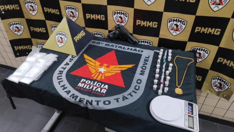 Dentro dela foram encontrados 14 pinos de substância análoga à cocaína. Além disso, foram apreendidos um simulacro de arma de fogo e uma balança de precisão, localizados embaixo do sofá da residência.