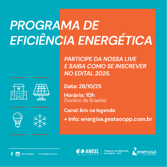 Está aberta a chamada pública do Grupo Energisa para seleção de projetos no âmbito do Programa de Eficiência Energética (PEE), regulado pela Aneel. A iniciativa incentiva o uso consciente da energia elétrica, com foco em soluções sustentáveis e combate ao desperdício. Os recursos do programa podem ser destinados a projetos rurais, de infraestrutura de iluminação pública, organizações sociais e órgãos públicos. Todos os clientes das áreas de concessão das distribuidoras do Grupo podem participar. O edital fica disponível até 19 de dezembro. As regras serão apresentadas em uma live nesta terça-feira (28/10), às 10h (horário de Brasília), pelo link.