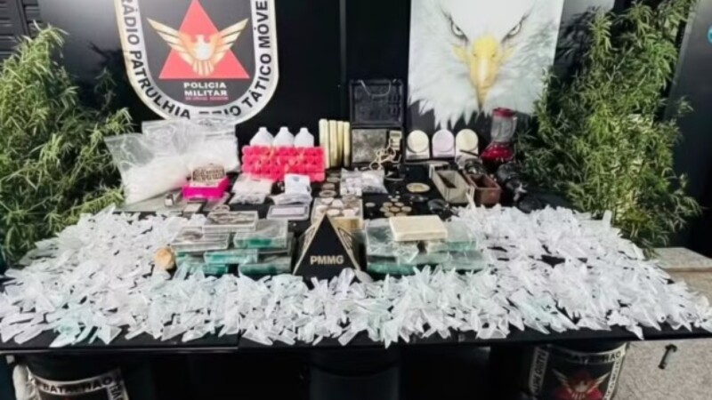 No imóvel, os policiais encontraram um sistema de segurança com duas câmeras de vigilância e apreenderam 09 barras de crack e uma pedra bruta da droga; 1.370 pinos de cocaína e porções de pasta base; 99 ampolas de fentanil e um galão de éter; 03 pés de maconha; Duas prensas e uma balança de precisão.