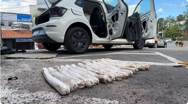 Segundo a PM, a equipe viu a dupla em atitude suspeita perto de uma motocicleta e de um carro e encontrou o material escondido no interior do automóvel.